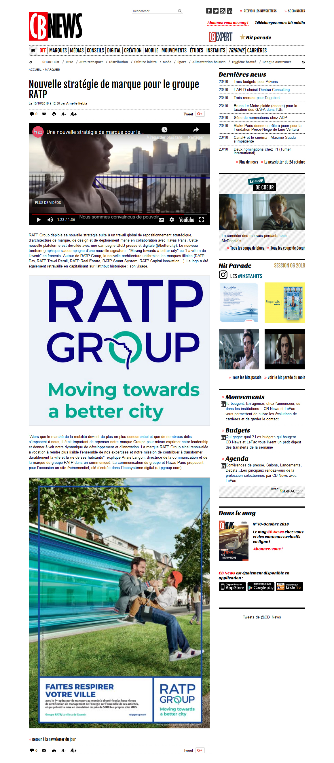 Article de CB News concernant le repositionnement stratégique du groupe RATP.